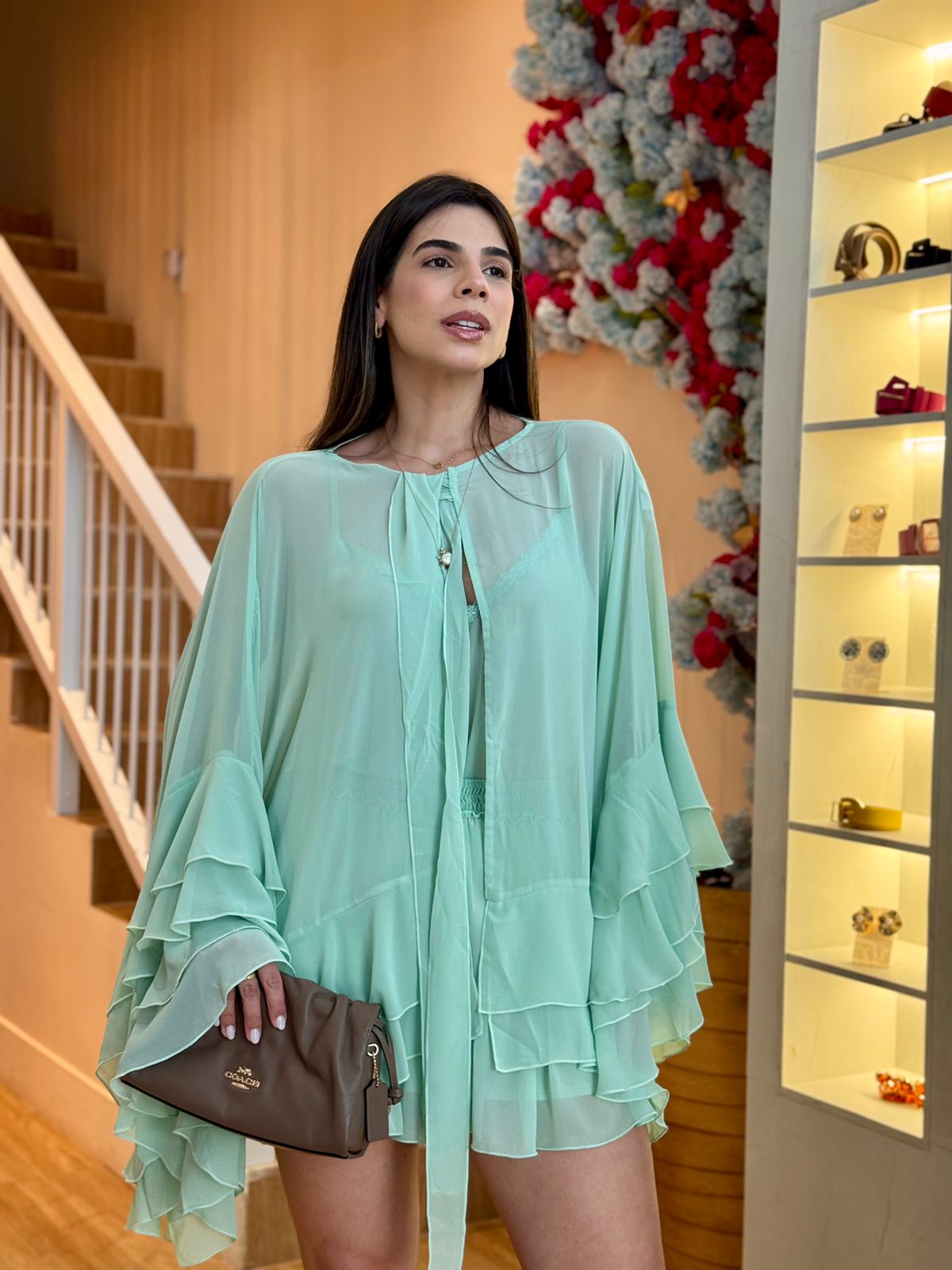 uma blusa, short, e colete